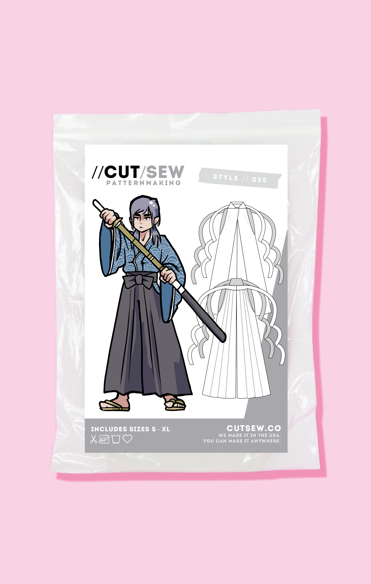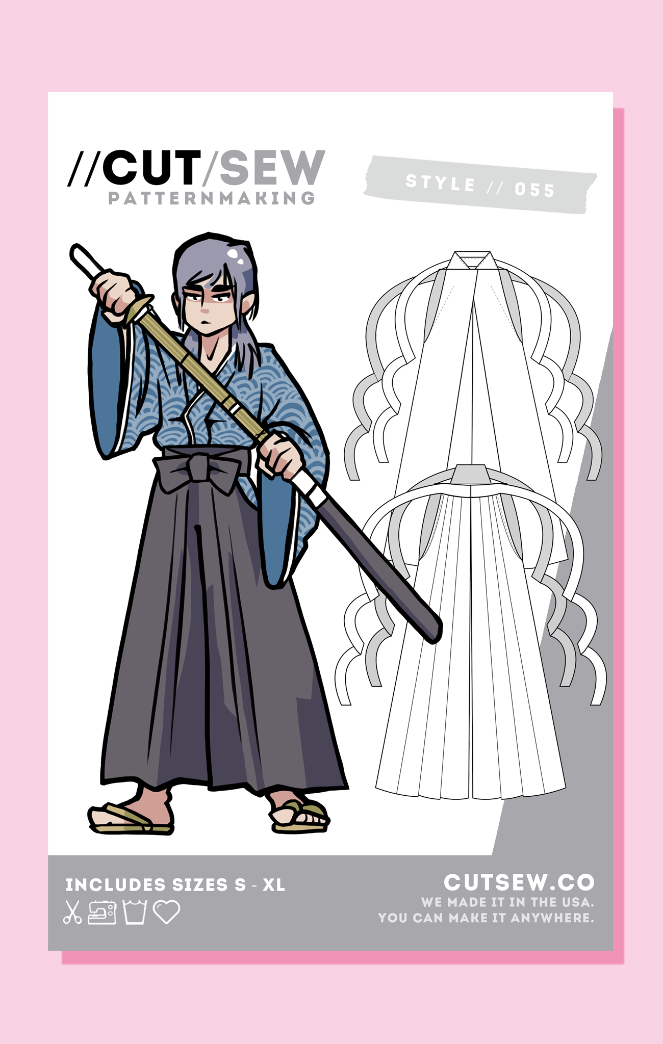 For love, for honor, for cosplaying beloved 90's samurai anime. This pattern is inspired by the construction of traditional Japanese hakama and features distinctive front and back pleating, an attached backboard, exposed hip folds, and fully adjustable waist ties that make it perfect for all of your Meiji-era cosplay needs, or just after school kendo practice.