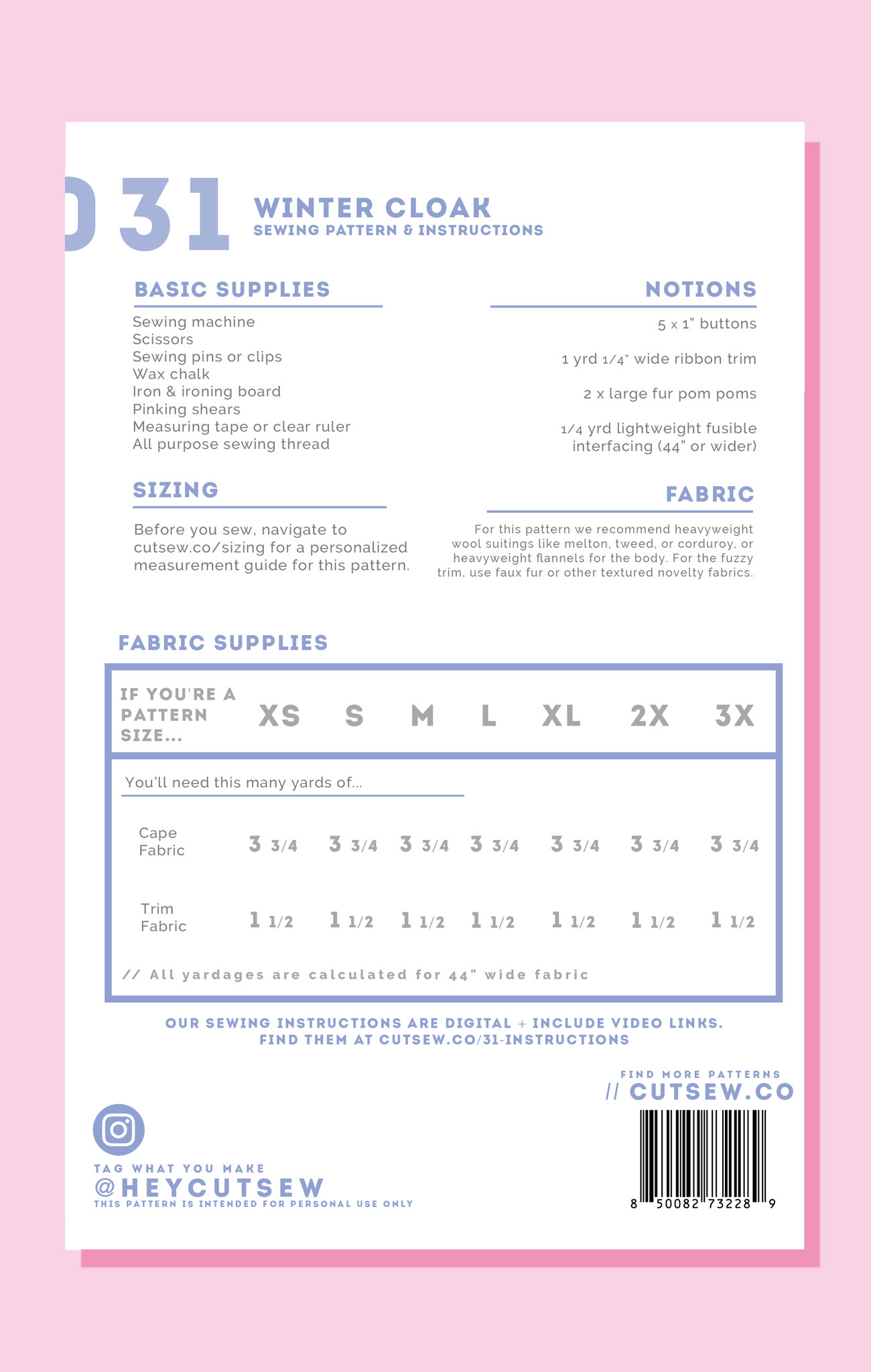 Winter is coming...and it's cute as hell. This adorable cape sewing pattern has a larger, looser fit and features a button front closure, customizable trim on the hood & hem, and it wouldn't be complete without bunny ears and decorative pom poms. A great project for absolute beginners, this is the pattern we recommend the most to customers looking for a quick & easy way to jump into sewing.